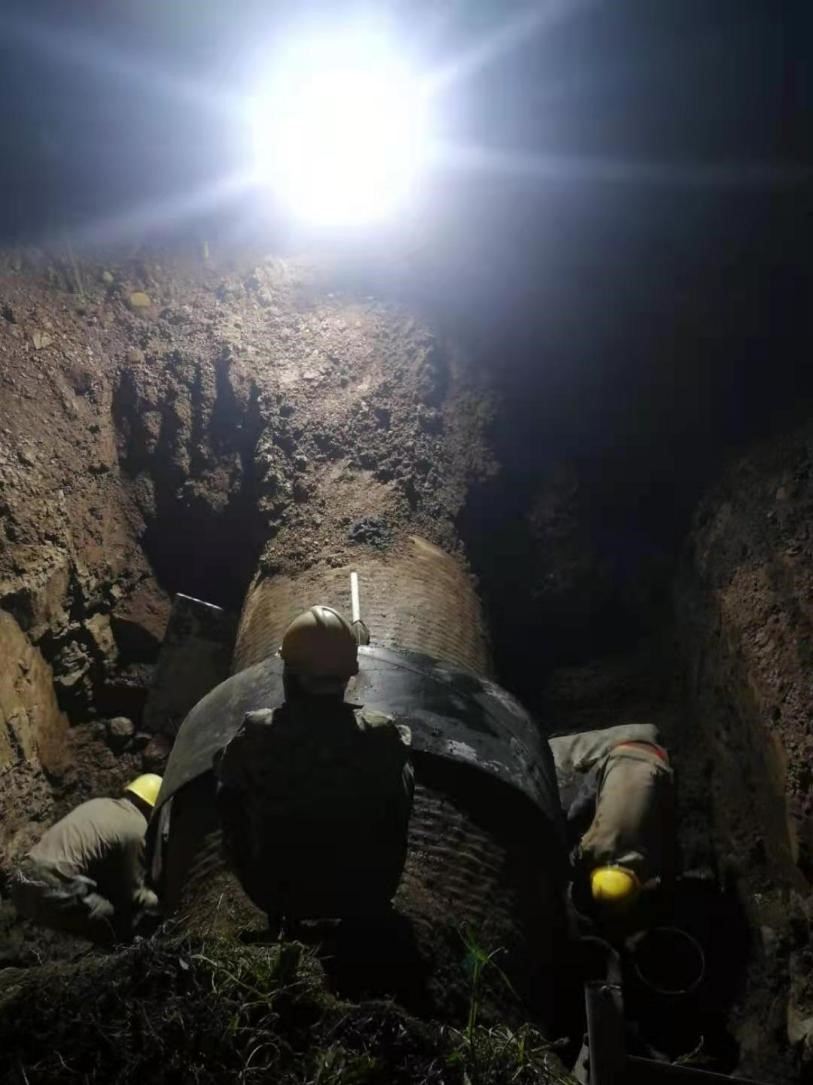 節(jié)假日的堅守,只為保障居民正常用水?!拔逡弧毙¢L假期間,安裝公司施工團隊放棄與家人的團聚,默默堅守在施工一線,用自己的實際行動確保了荊門城區(qū)的居民正常用水安全。5月1日晚21:00,經過割接施工方案優(yōu)化,物資儲備等一系列前期準備后,DN1200源水管線管網開始降水,搶口工作正式開始,經過近5個小時的精心施工后,5月2日凌晨3時左右,隨著最后一塊開孔封蓋焊接結束,DN1200源水管線搶扣工作正式宣告完成。