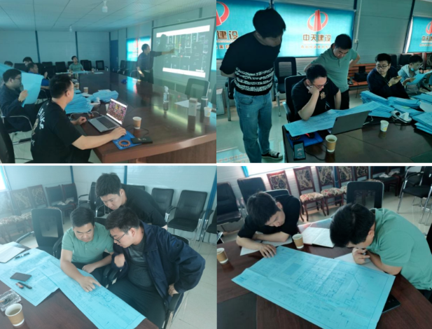 (小伙子們利用休息時(shí)間研究圖紙)