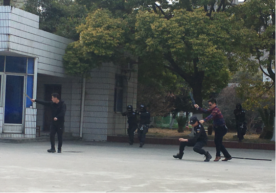 本次演練以在全國“兩會”召開前夕,2名暴恐份子密謀在市供水總公司三水廠采取投毒方式實(shí)施暴恐襲擊為背景展開。市公安局指揮中心接到水廠員工報案,2名暴恐份子駕車攜帶劇毒氰化物和匕首來到三水廠,密謀投毒、傷人。市公安局指揮中心立即派轄區(qū)派出所和巡邏組前往處置。在投毒失敗后,嫌疑人刺傷安保人員并挾持人質(zhì),與民警對峙。隨后,市公安局迅速啟動反恐防范一級響應(yīng),調(diào)派轄區(qū)分局、巡特警、刑偵、交警等部門趕赴現(xiàn)場開展工作。短短3分鐘,暴徒迅速被控制,其中有一名暴徒被當(dāng)場擊斃,人質(zhì)被成功解救。之后,120急救中心趕往現(xiàn)場救治,同時環(huán)境監(jiān)測部門迅速開展水質(zhì)檢測評估,確保水廠供水安全。至此,反恐防暴演練活動順利結(jié)束。