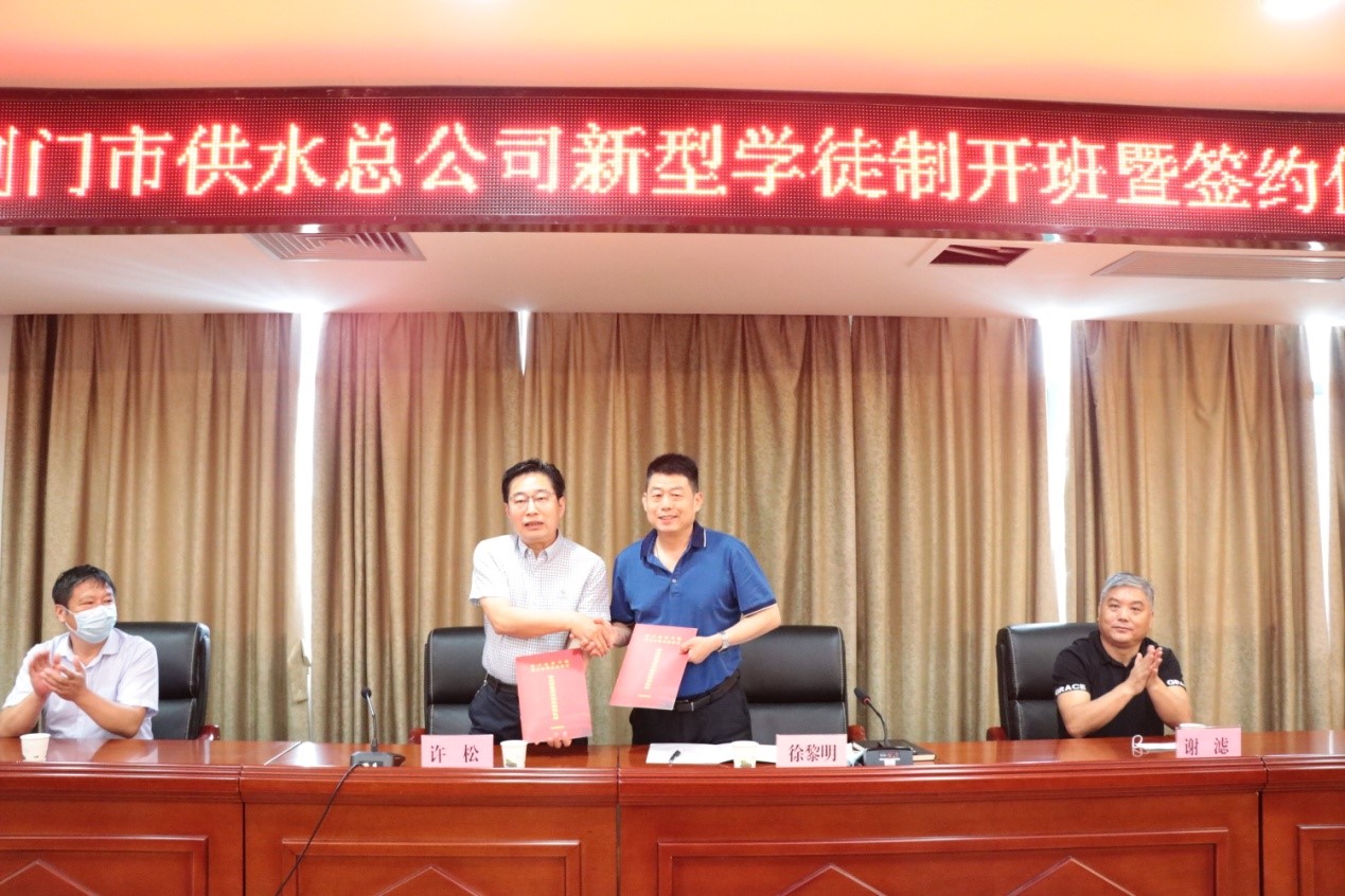 6月10日上午,市供水總公司與荊門技師學(xué)院簽訂《校企合作協(xié)議》《企業(yè)新型學(xué)徒制辦班協(xié)議》,搭建起培養(yǎng)高技能人才培養(yǎng)高速通道,開啟訂單培養(yǎng)企業(yè)工匠新模式。簽約完成后舉行了新型學(xué)徒制首期開班儀式,校企雙方近40人參加活動。